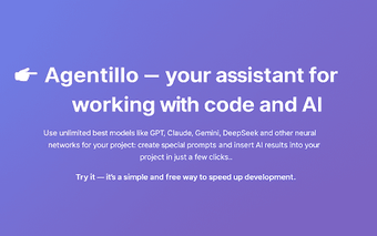 Agentillo, tarayıcı tabanlı bir uzantı olarak, kullanıcıların kod projeleri üzerinde yapay zeka ile etkileşimde bulunmalarına olanak tanır. Kullanıcılar, GPT, Claude, Gemini ve DeepSeek gibi en iyi yapay zeka modellerini kullanarak projelerini hızla geliştirebilirler. Üç basit adımda, uzantı ile proje dosyalarını seçerek, AI için optimal bir komut oluşturulmasını sağlar ve AI'dan gelen yanıtları projeye entegre edebilirler.